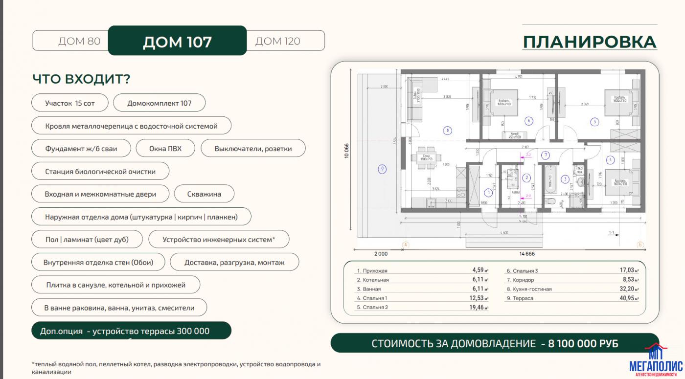 В стоимость входит: участок, электричество 15 кВт, отопление от электрокотла, радиаторы отопления, канализация, водоснабжение, отделка под ключ с установкой сантехники.